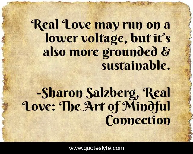 This page presents the quote "Real Love may run on a lower voltage, but it’s also more grounded & sustainable.". Author of this quote is Sharon Salzberg, Real Love: The Art of Mindful Connection. This quote is about relationships, love, mindfulness, sustainability, meditation, real-love, affection,.