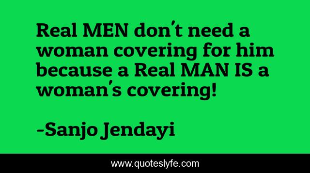 This page presents the quote "Real MEN don't need a woman covering for him because a Real MAN IS a woman's covering!". Author of this quote is Sanjo Jendayi. This quote is about real, woman, covering, sanjo-jendayi, men, cover, deserie-johnson, man,.