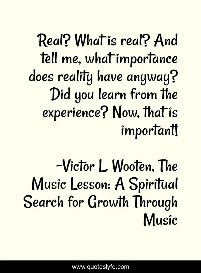 This page presents the quote "Real? What is real? And tell me, what importance does reality have anyway? Did you learn from the experience? Now, that is important!". Author of this quote is Victor L. Wooten, The Music Lesson: A Spiritual Search for Growth Through Music. This quote is about experience, reality,.