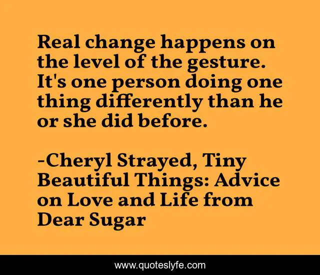 "Cheryl Strayed, Tiny Beautiful Things: Advice on Love and Life from Dear Sugar Quotes." Quoteslyfe.com, 2025. Fri. 05 Dec. 2025. <https://www.quoteslyfe.com/quote/Real-change-happens-on-the-level-of-59982>.