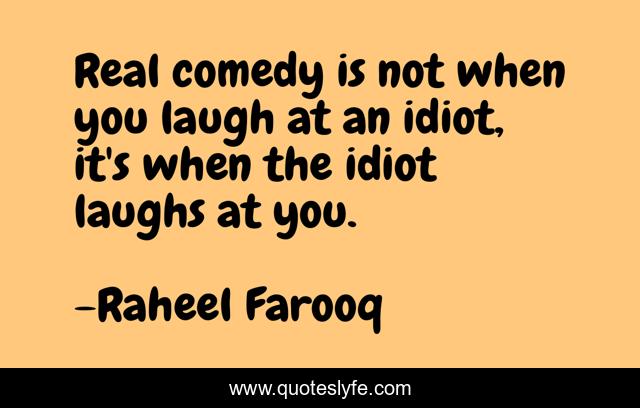 This page presents the quote "Real comedy is not when you laugh at an idiot, it's when the idiot laughs at you.". Author of this quote is Raheel Farooq. This quote is about funny, folly, foolishness, funny-but-true, idiots, fools, comedy, laughter,.