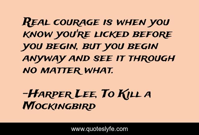 This page presents the quote "Real courage is when you know you're licked before you begin, but you begin anyway and see it through no matter what.". Author of this quote is Harper Lee, To Kill a Mockingbird. This quote is about perseverance, moral-courage, character, courage, inspirational, tenacity, enthusiasm,.