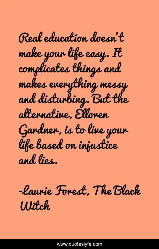 This page presents the quote "Real education doesn't make your life easy. It complicates things and makes everything messy and disturbing. But the alternative, Elloren Gardner, is to live your life based on injustice and lies.". Author of this quote is Laurie Forest, The Black Witch. This quote is about education, prejudice,.