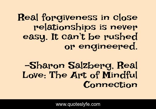 This page presents the quote "Real forgiveness in close relationships is never easy. It can’t be rushed or engineered.". Author of this quote is Sharon Salzberg, Real Love: The Art of Mindful Connection. This quote is about relationships, love, mindfulness, real-love, understanding, healthy-relationships, meditation, forgiveness, affection,.