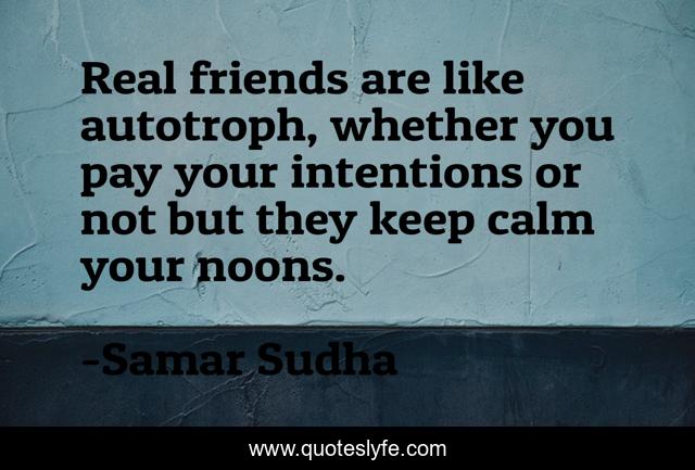 This page presents the quote "Real friends are like autotroph, whether you pay your intentions or not but they keep calm your noons.". Author of this quote is Samar Sudha. This quote is about real, friendship, calmness-and-happiness, friends, autotroph, calm, noons,.