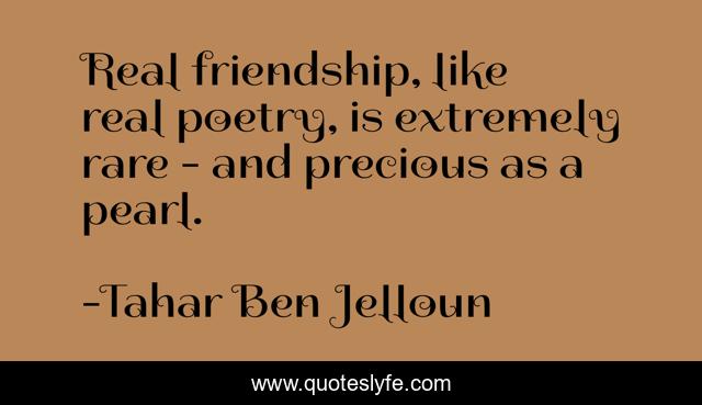 This page presents the quote "Real friendship, like real poetry, is extremely rare - and precious as a pearl.". Author of this quote is Tahar Ben Jelloun. This quote is about real, precious, poetry,.