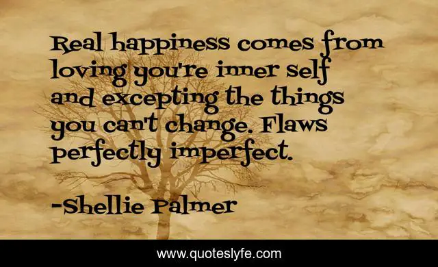 This page presents the quote "Real happiness comes from loving you're inner self and excepting the things you can't change. Flaws perfectly imperfect.". Author of this quote is Shellie Palmer. This quote is about quotes-to-live-by, self-love, love-yourself, happiness, self-esteem,.