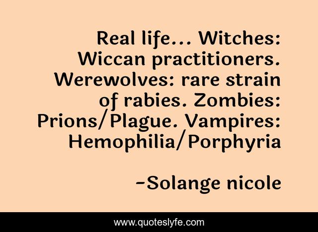 This page presents the quote "Real life... Witches: Wiccan practitioners. Werewolves: rare strain of rabies. Zombies: Prions/Plague. Vampires: Hemophilia/Porphyria". Author of this quote is Solange nicole. This quote is about humorous, halloween, satire, real-life, solange, monsters,.
