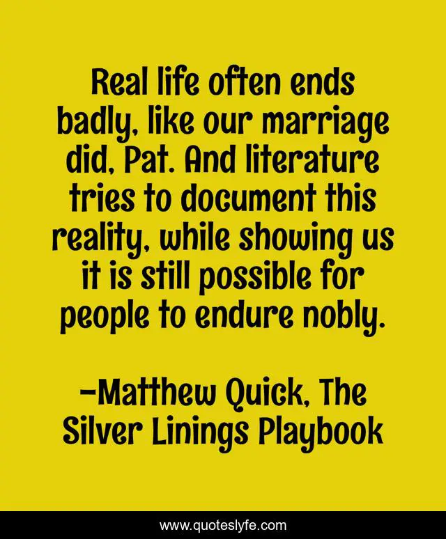 This page presents the quote "Real life often ends badly, like our marriage did, Pat. And literature tries to document this reality, while showing us it is still possible for people to endure nobly.". Author of this quote is Matthew Quick, The Silver Linings Playbook. This quote is about advice, literature, real-life,.