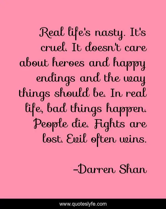 This page presents the quote "Real life's nasty. It's cruel. It doesn't care about heroes and happy endings and the way things should be. In real life, bad things happen. People die. Fights are lost. Evil often wins.". Author of this quote is Darren Shan. .