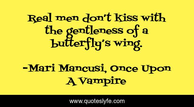 This page presents the quote "Real men don’t kiss with the gentleness of a butterfly’s wing.". Author of this quote is Mari Mancusi, Once Upon A Vampire. This quote is about uf-romance, urban-fantasy-romance, vampires, author, writer, paranormal-romance,.