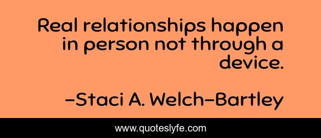 This page presents the quote "Real relationships happen in person not through a device.". Author of this quote is Staci A. Welch-Bartley. This quote is about relationships, love, dating-advice, dating, dating-coach, affection,.