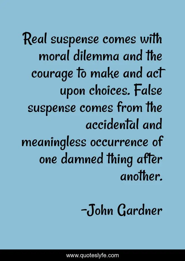 This page presents the quote "Real suspense comes with moral dilemma and the courage to make and act upon choices. False suspense comes from the accidental and meaningless occurrence of one damned thing after another.". Author of this quote is John Gardner. This quote is about suspense, writing,.