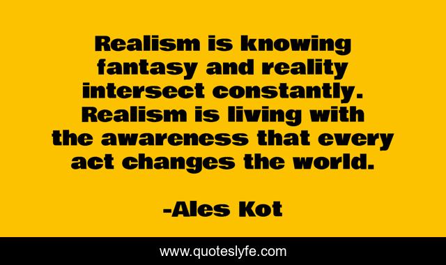 This page presents the quote "Realism is knowing fantasy and reality intersect constantly. Realism is living with the awareness that every act changes the world.". Author of this quote is Ales Kot. This quote is about fantasy, realism, fiction,.