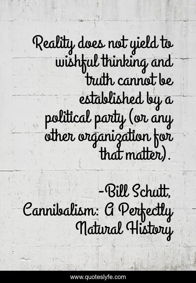 This page presents the quote "Reality does not yield to wishful thinking and truth cannot be established by a political party (or any other organization for that matter).". Author of this quote is Bill Schutt, Cannibalism: A Perfectly Natural History. This quote is about politics, truth, reality,.