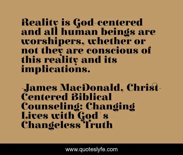 This page presents the quote "Reality is God-centered and all human beings are worshipers, whether or not they are conscious of this reality and its implications.". Author of this quote is James MacDonald, Christ-Centered Biblical Counseling: Changing Lives with God's Changeless Truth. This quote is about idolatry, worship,.