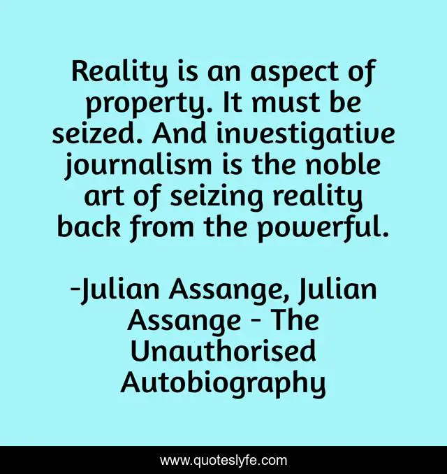This page presents the quote "Reality is an aspect of property. It must be seized. And investigative journalism is the noble art of seizing reality back from the powerful.". Author of this quote is Julian Assange, Julian Assange - The Unauthorised Autobiography. This quote is about investigative, investigative-journalism, reality,.
