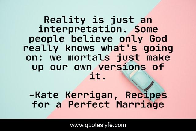 This page presents the quote "Reality is just an interpretation. Some people believe only God really knows what's going on: we mortals just make up our own versions of it.". Author of this quote is Kate Kerrigan, Recipes for a Perfect Marriage. .