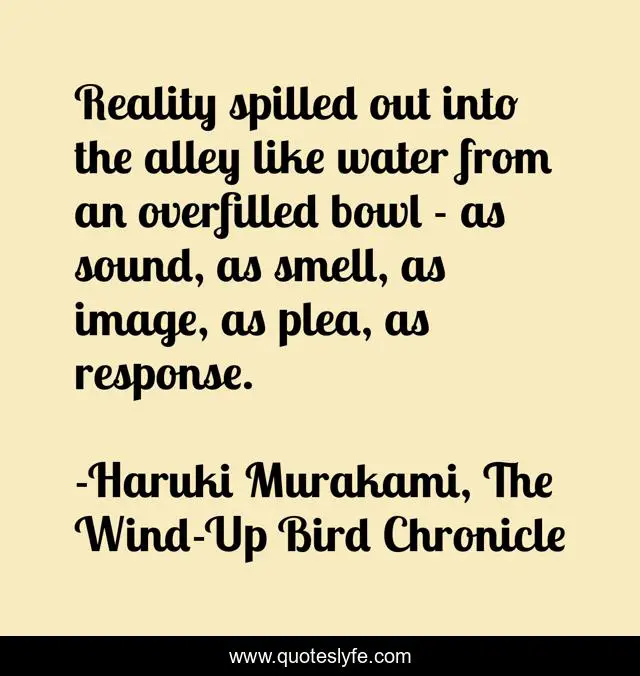 This page presents the quote "Reality spilled out into the alley like water from an overfilled bowl - as sound, as smell, as image, as plea, as response.". Author of this quote is Haruki Murakami, The Wind-Up Bird Chronicle. .