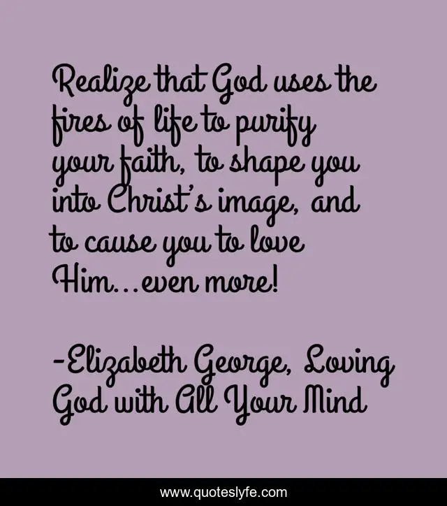 This page presents the quote "Realize that God uses the fires of life to purify your faith, to shape you into Christ’s image, and to cause you to love Him…even more!". Author of this quote is Elizabeth George, Loving God with All Your Mind. This quote is about faith, life, christian, christ, fire, god, image, shape, pure,.