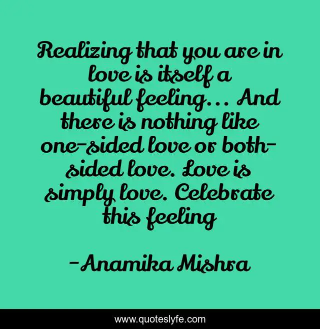 This page presents the quote "Realizing that you are in love is itself a beautiful feeling... And there is nothing like one-sided love or both-sided love. Love is simply love. Celebrate this feeling". Author of this quote is Anamika Mishra. This quote is about beauty, love, first-love, affection, feelings,.