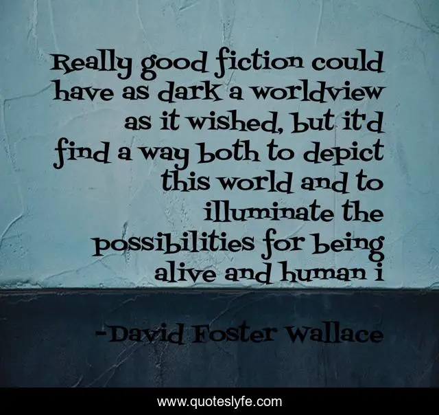 This page presents the quote "Really good fiction could have as dark a worldview as it wished, but it'd find a way both to depict this world and to illuminate the possibilities for being alive and human i". Author of this quote is David Foster Wallace. This quote is about darkness, worldview, american-psycho, fiction, mankind, human, humanity, on-fiction, perspective,.
