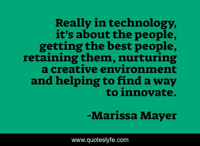 This page presents the quote "Really in technology, it's about the people, getting the best people, retaining them, nurturing a creative environment and helping to find a way to innovate.". Author of this quote is Marissa Mayer. This quote is about creative, technology, people,.