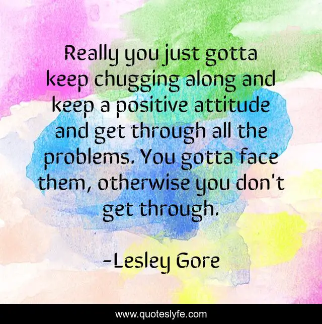 This page presents the quote "Really you just gotta keep chugging along and keep a positive attitude and get through all the problems. You gotta face them, otherwise you don't get through.". Author of this quote is Lesley Gore. This quote is about positive, confidence, problems,.