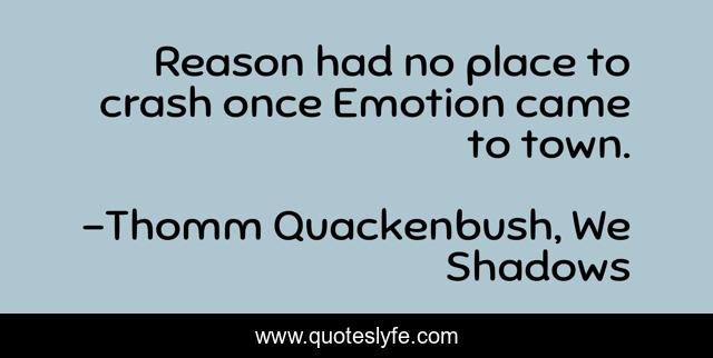 This page presents the quote "Reason had no place to crash once Emotion came to town.". Author of this quote is Thomm Quackenbush, We Shadows. This quote is about emotion, reason, sense,.