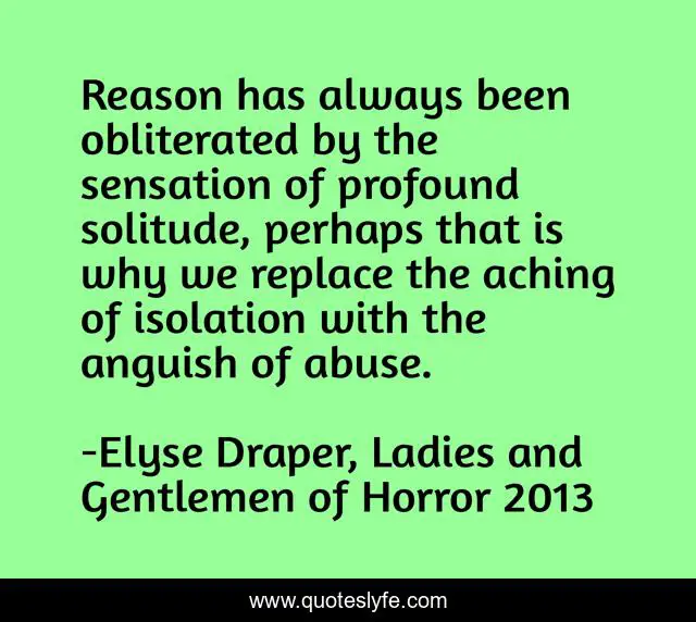 This page presents the quote "Reason has always been obliterated by the sensation of profound solitude, perhaps that is why we replace the aching of isolation with the anguish of abuse.". Author of this quote is Elyse Draper, Ladies and Gentlemen of Horror 2013. This quote is about human-nature, loneliness-or-solitude,.