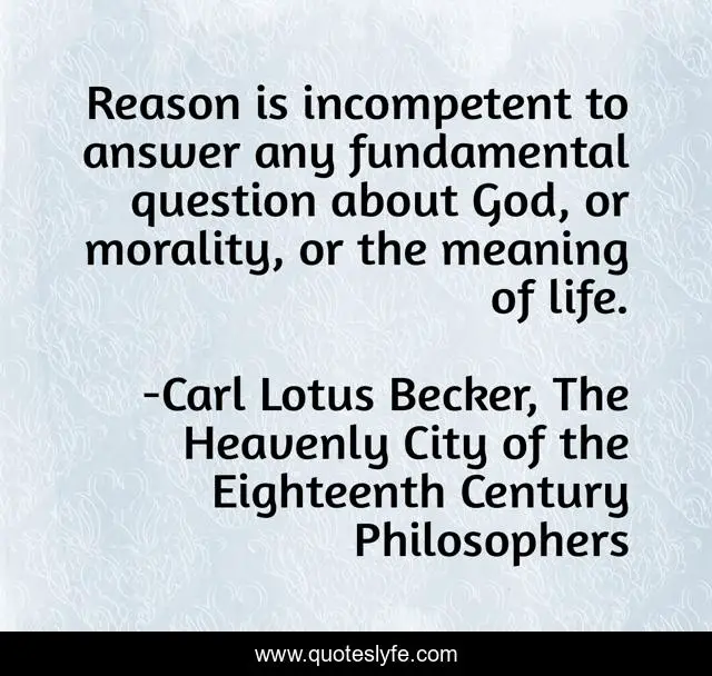 This page presents the quote "Reason is incompetent to answer any fundamental question about God, or morality, or the meaning of life.". Author of this quote is Carl Lotus Becker, The Heavenly City of the Eighteenth Century Philosophers. This quote is about god, life, reason, the-meaning-of-life,.