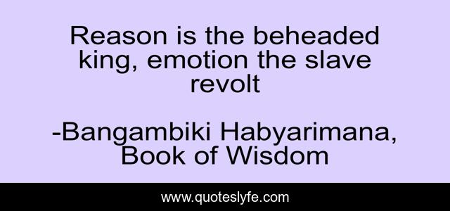 This page presents the quote "Reason is the beheaded king, emotion the slave revolt". Author of this quote is Bangambiki Habyarimana, Book of Wisdom. This quote is about emotion, reason-vs-faith, reason, emotions, power-of-emotions,.