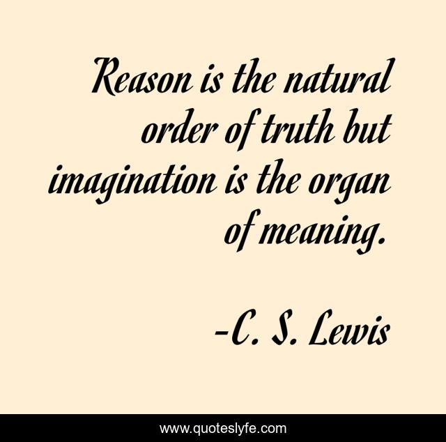 This page presents the quote "Reason is the natural order of truth but imagination is the organ of meaning.". Author of this quote is C. S. Lewis. This quote is about imagination, meaning,.