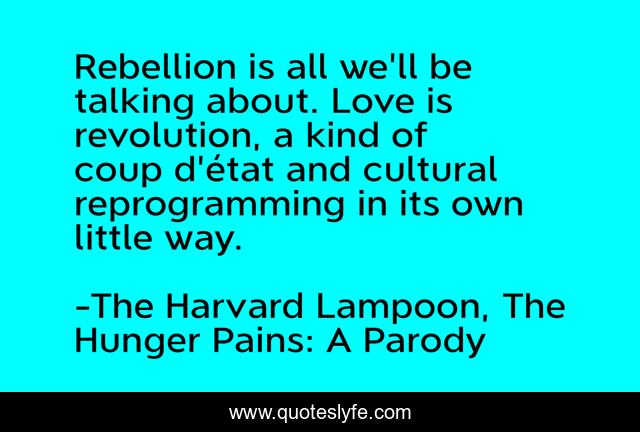This page presents the quote "Rebellion is all we'll be talking about. Love is revolution, a kind of coup d'état and cultural reprogramming in its own little way.". Author of this quote is The Harvard Lampoon, The Hunger Pains: A Parody. This quote is about love, humour, insight, rebellion, culture, affection,.