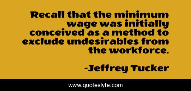 This page presents the quote "Recall that the minimum wage was initially conceived as a method to exclude undesirables from the workforce.". Author of this quote is Jeffrey Tucker. This quote is about economics, force, statism, libertarian, collectivism, coercion, anarchy, free-market, anarcho-capitalism,.