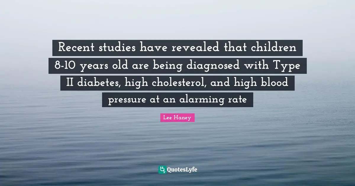 This page presents the quote "Recent studies have revealed that children 8-10 years old are being diagnosed with Type II diabetes, high cholesterol, and high blood pressure at an alarming rate". Author of this quote is Lee Haney. This quote is about blood, type, diabetes, cholesterol, children, rate, pressure, years,.