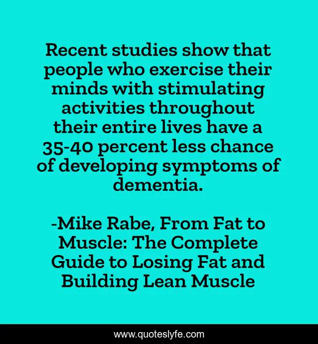 This page presents the quote "Recent studies show that people who exercise their minds with stimulating activities throughout their entire lives have a 35-40 percent less chance of developing symptoms of dementia.". Author of this quote is Mike Rabe, From Fat to Muscle: The Complete Guide to Losing Fat and Building Lean Muscle. This quote is about mind, health-and-fitness,.