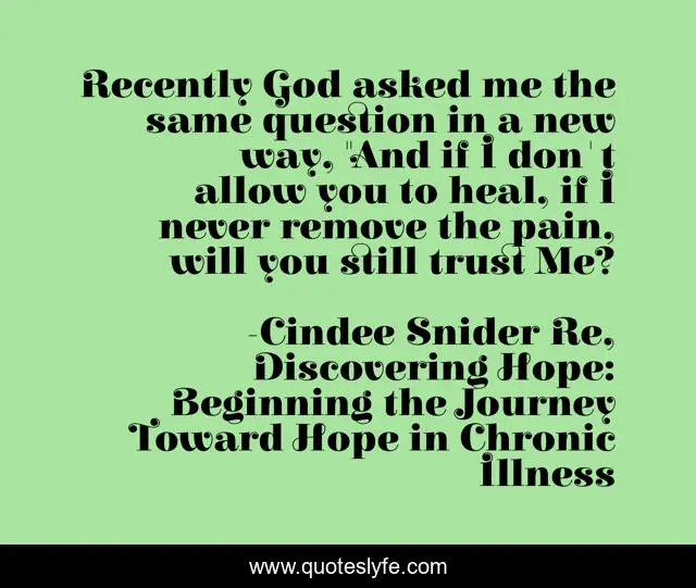 This page presents the quote "Recently God asked me the same question in a new way, "And if I don't allow you to heal, if I never remove the pain, will you still trust Me?". Author of this quote is Cindee Snider Re, Discovering Hope: Beginning the Journey Toward Hope in Chronic Illness. This quote is about god, chronic-illness, pain, heal,.