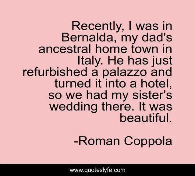 This page presents the quote "Recently, I was in Bernalda, my dad's ancestral home town in Italy. He has just refurbished a palazzo and turned it into a hotel, so we had my sister's wedding there. It was beautiful.". Author of this quote is Roman Coppola. This quote is about beautiful, home, sister,.