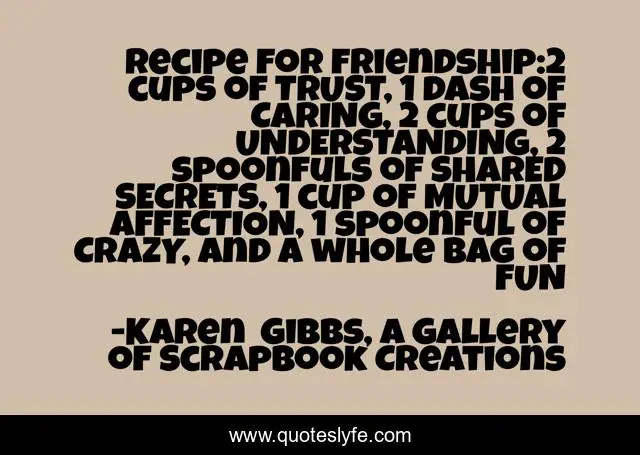 This page presents the quote "Recipe for friendship:2 cups of TRUST, 1 dash of CARING, 2 cups of UNDERSTANDING, 2 spoonfuls of SHARED SECRETS, 1 cup of MUTUAL AFFECTION, 1 spoonful of CRAZY, and a whole bag of FUN". Author of this quote is Karen Gibbs, A Gallery of Scrapbook Creations. This quote is about confidence, positive, motivational, optimistic, inspirational, life-changing, enthusiasm, life-and-living, friendship,.