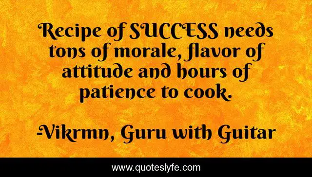 This page presents the quote "Recipe of SUCCESS needs tons of morale, flavor of attitude and hours of patience to cook.". Author of this quote is Vikrmn, Guru with Guitar. This quote is about motivation, success, positive, motivational, gwg, ca-vikram-verma, guru-with-guitar, behaviour, patience,.