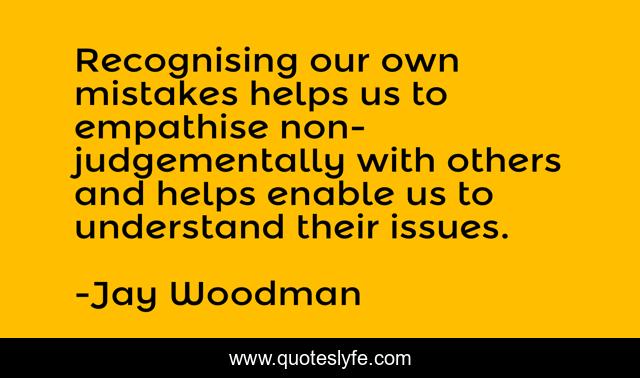 This page presents the quote "Recognising our own mistakes helps us to empathise non-judgementally with others and helps enable us to understand their issues.". Author of this quote is Jay Woodman. This quote is about empathise, understanding-others, non-judgemental, understanding, mistakes, understand, non-judgment,.