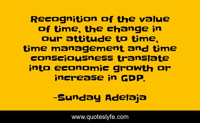 This page presents the quote "Recognition of the value of time, the change in our attitude to time, time management and time consciousness translate into economic growth or increase in GDP.". Author of this quote is Sunday Adelaja. This quote is about gdp, value, time,.