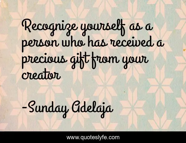 This page presents the quote "Recognize yourself as a person who has received a precious gift from your creator". Author of this quote is Sunday Adelaja. This quote is about life, gift, creator, calling, purpose, truth, recognition,.