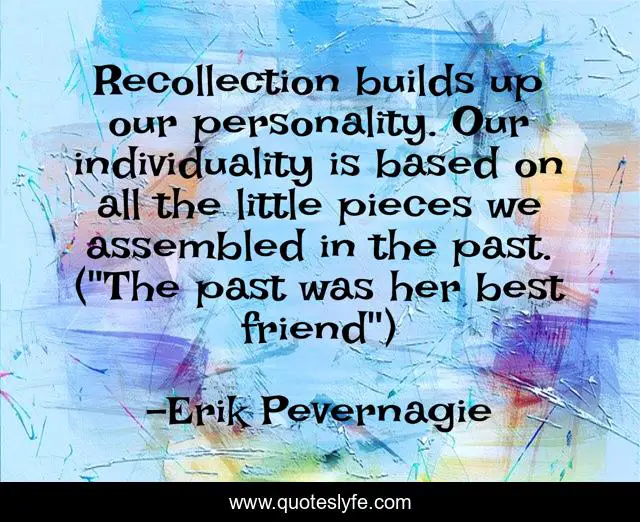 This page presents the quote "Recollection builds up our personality. Our individuality is based on all the little pieces we assembled in the past. ("The past was her best friend")". Author of this quote is Erik Pevernagie. This quote is about best-friend, individuality, base-on, pieces, past, recollection, assemble, build-up, personality,.