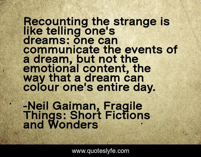 This page presents the quote "Recounting the strange is like telling one's dreams: one can communicate the events of a dream, but not the emotional content, the way that a dream can colour one's entire day.". Author of this quote is Neil Gaiman, Fragile Things: Short Fictions and Wonders. .
