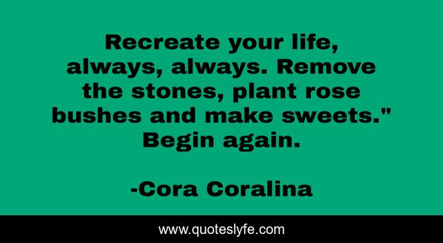 This page presents the quote "Recreate your life, always, always. Remove the stones, plant rose bushes and make sweets." Begin again.". Author of this quote is Cora Coralina. This quote is about always, life, healing, starting-over,.
