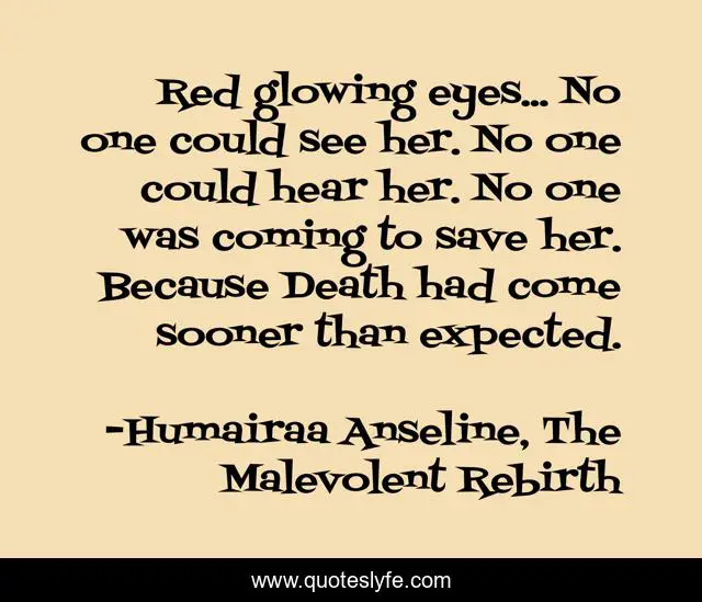 This page presents the quote "Red glowing eyes... No one could see her. No one could hear her. No one was coming to save her. Because Death had come sooner than expected.". Author of this quote is Humairaa Anseline, The Malevolent Rebirth. This quote is about young-adult-suspense, debut-novel, young-adult-thriller, young-adult-fiction, mystery-suspense, mystery-thriller, paranormal-suspense, suspense, young-adult,.