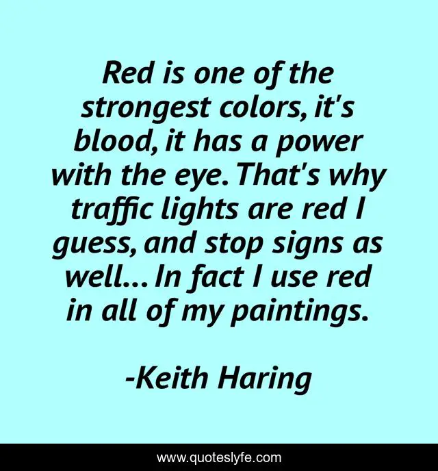 This page presents the quote "Red is one of the strongest colors, it's blood, it has a power with the eye. That's why traffic lights are red I guess, and stop signs as well... In fact I use red in all of my paintings.". Author of this quote is Keith Haring. This quote is about colors, eye, red,.