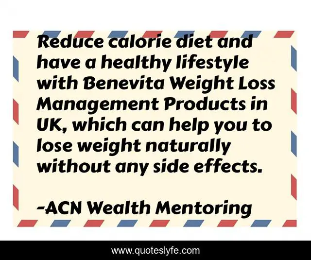 This page presents the quote "Reduce calorie diet and have a healthy lifestyle with Benevita Weight Loss Management Products in UK, which can help you to lose weight naturally without any side effects.". Author of this quote is ACN Wealth Mentoring. This quote is about loss, products, uk, weight,.
